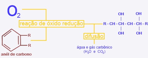 Através de uma reação de óxido redução, o oxigênio transforma as moléculas responsáveis pelo escurecimento dos dentes, também conhecidas como anéis de carbono, em estruturas químicas mais simples, tendo como resto desta reação, água e gás carbonico, que são eliminados dos dentes por um processo de difusão, responsável pela sensibilidade dental durante o clareamento. |