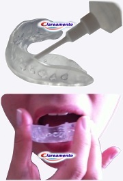 O modo de usar é bastante simples, basta um pouco de água quente para a confecção das moldeiras, aplicar o gel clareador nelas e coloca-las em posição na boca. |